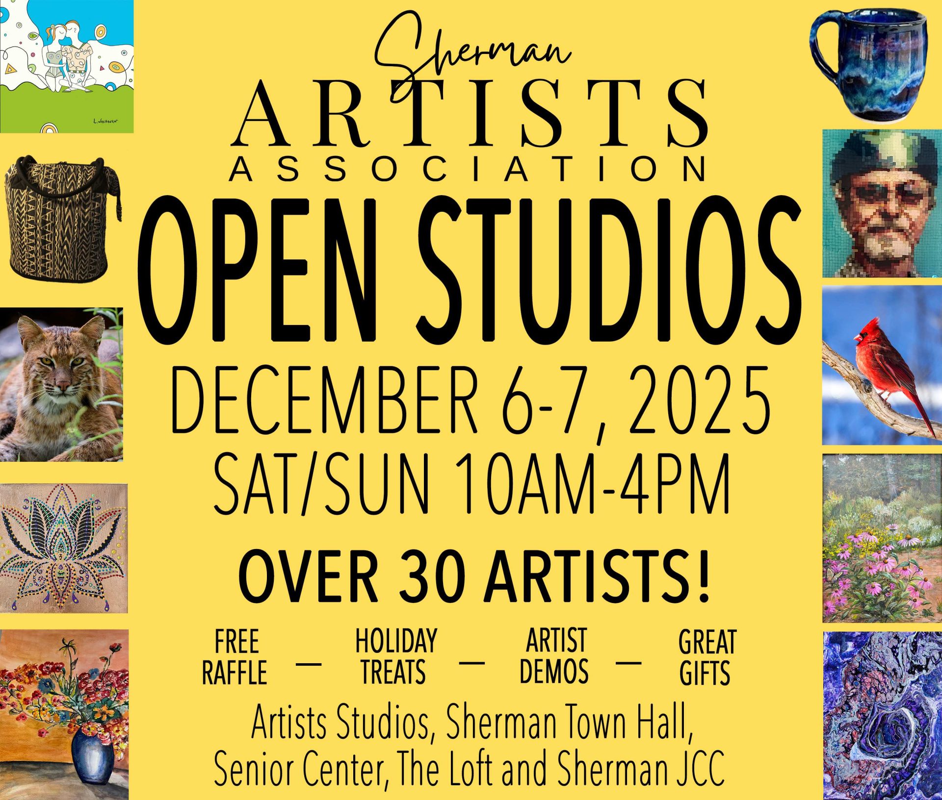 “Sherman Artists Association advances the education of visual artists and the public by providing a means for artists to share their knowledge, support, and inspiration, thereby enriching the cultural life of the Sherman community and beyond.”