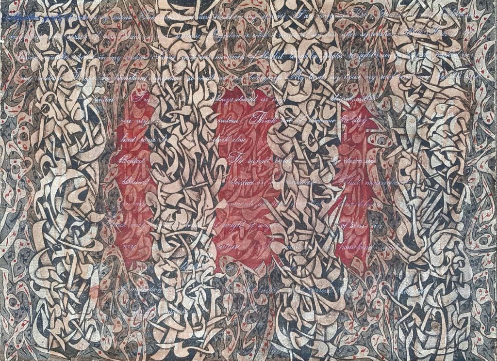 Awrang’s style is contemporary, fusing traditional calligraphy with modern abstraction. Letters become shapes. Language becomes atmosphere. Meaning is felt as much as it is read.